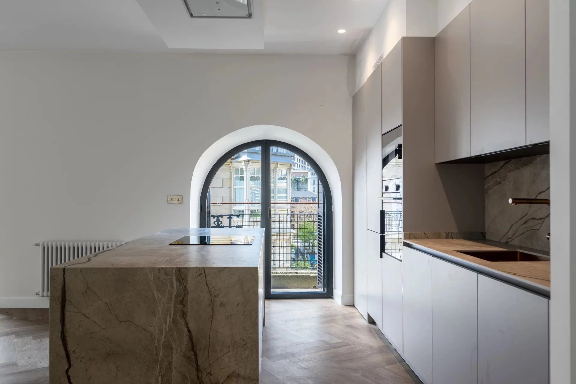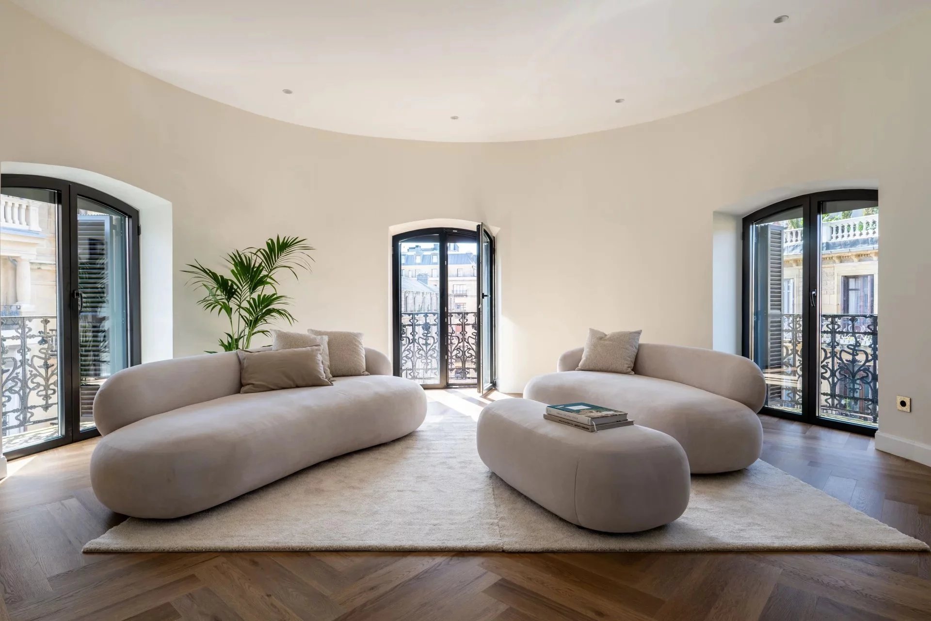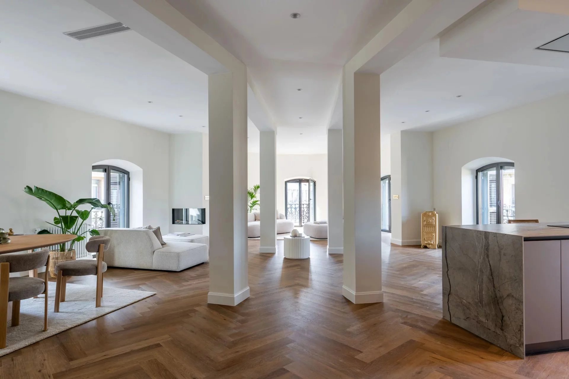 Upon entering, one is welcomed into a spacious living and dining area with an open kitchen, designed as a generous, elegant, and highly functional space. The modern, fully equipped kitchen features a central island and flows seamlessly into the dining area and the living room, enhanced by a decorative fireplace. The reception area extends towards a cozy sitting space located in the distinctive oval end of the property, one of the apartment’s most unique architectural features.