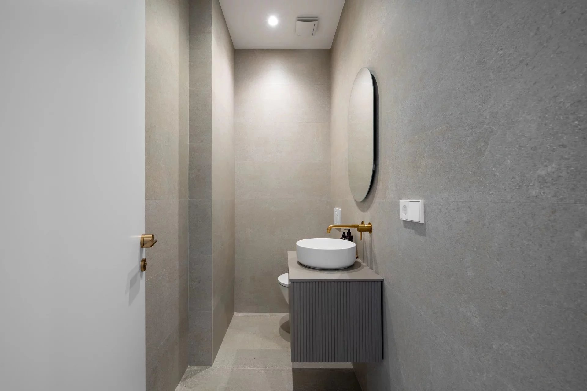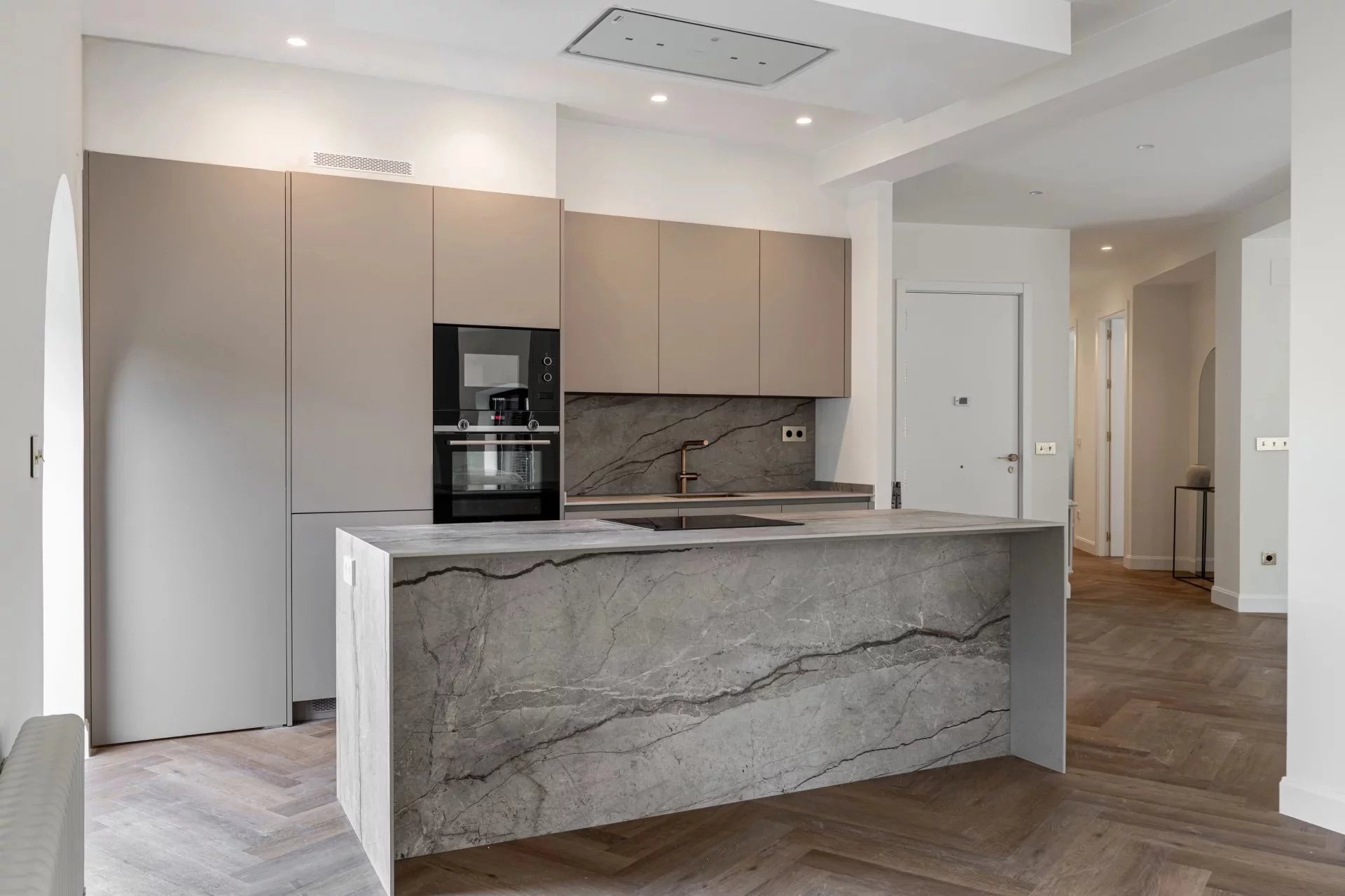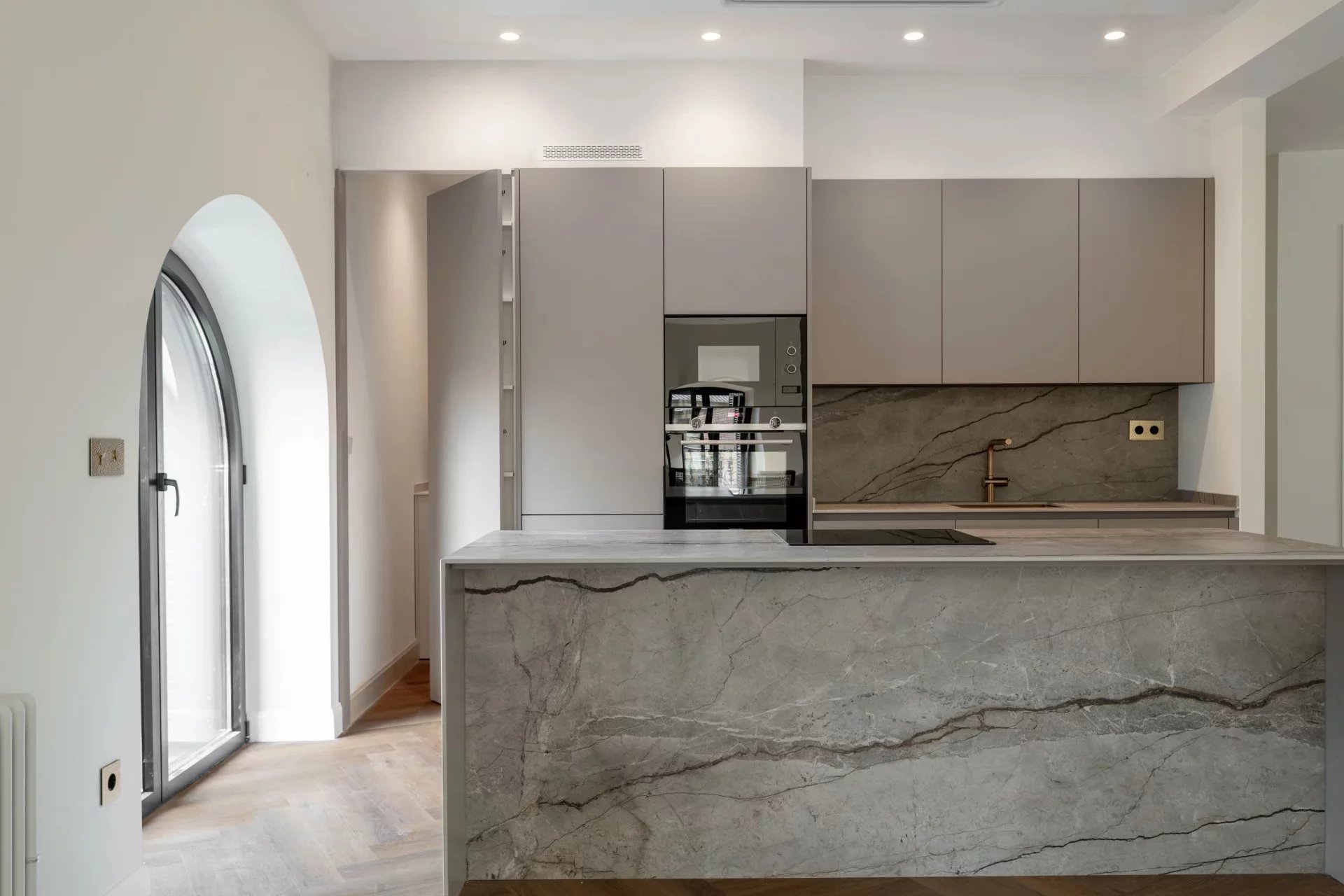 Upon entering, one is welcomed into a spacious living and dining area with an open kitchen, designed as a generous, elegant, and highly functional space. The modern, fully equipped kitchen features a central island and flows seamlessly into the dining area and the living room, enhanced by a decorative fireplace. The reception area extends towards a cozy sitting space located in the distinctive oval end of the property, one of the apartment’s most unique architectural features.