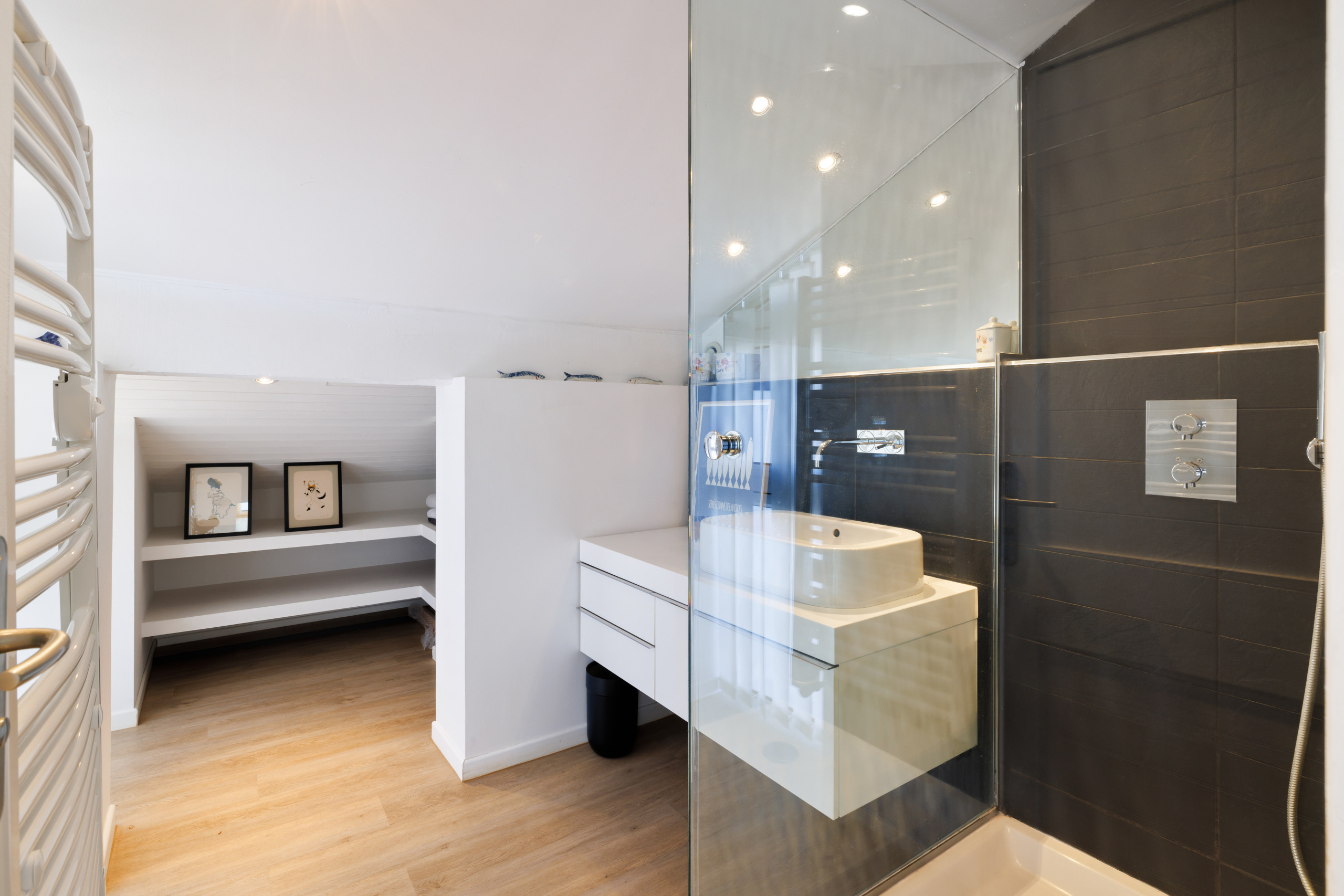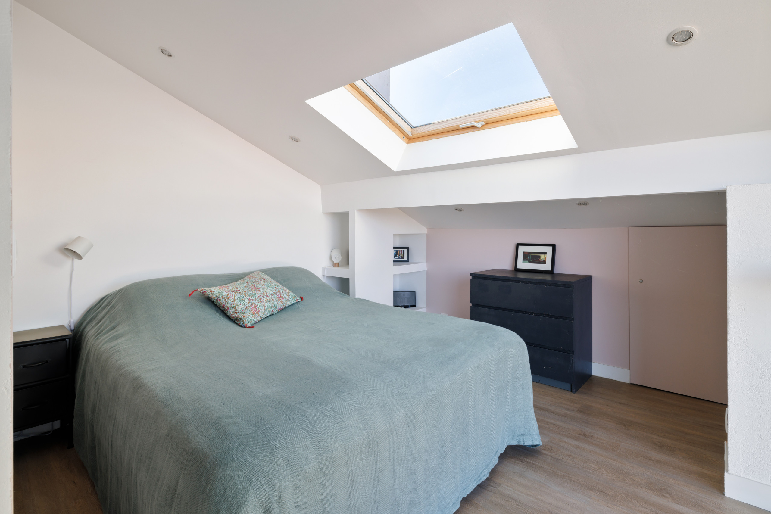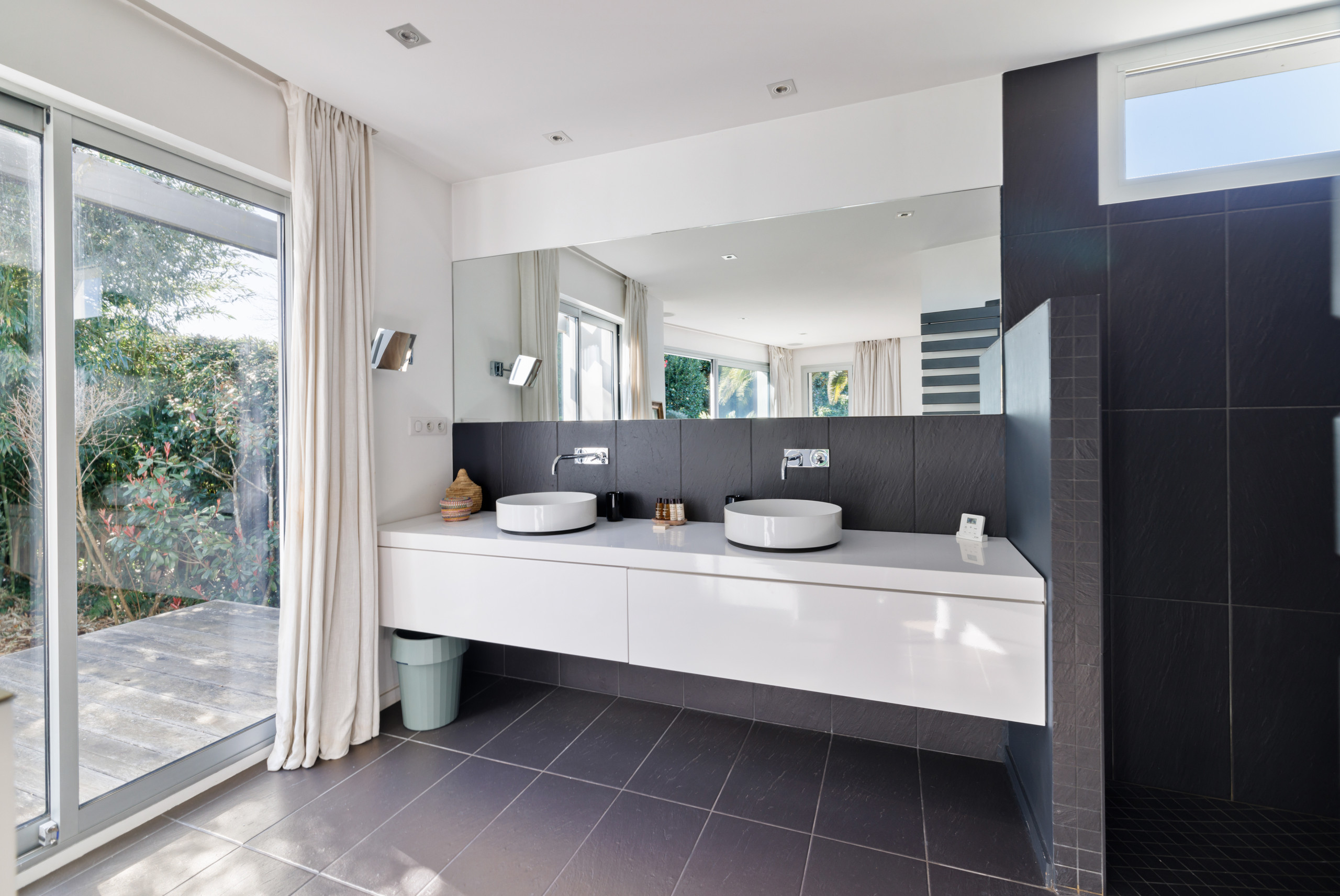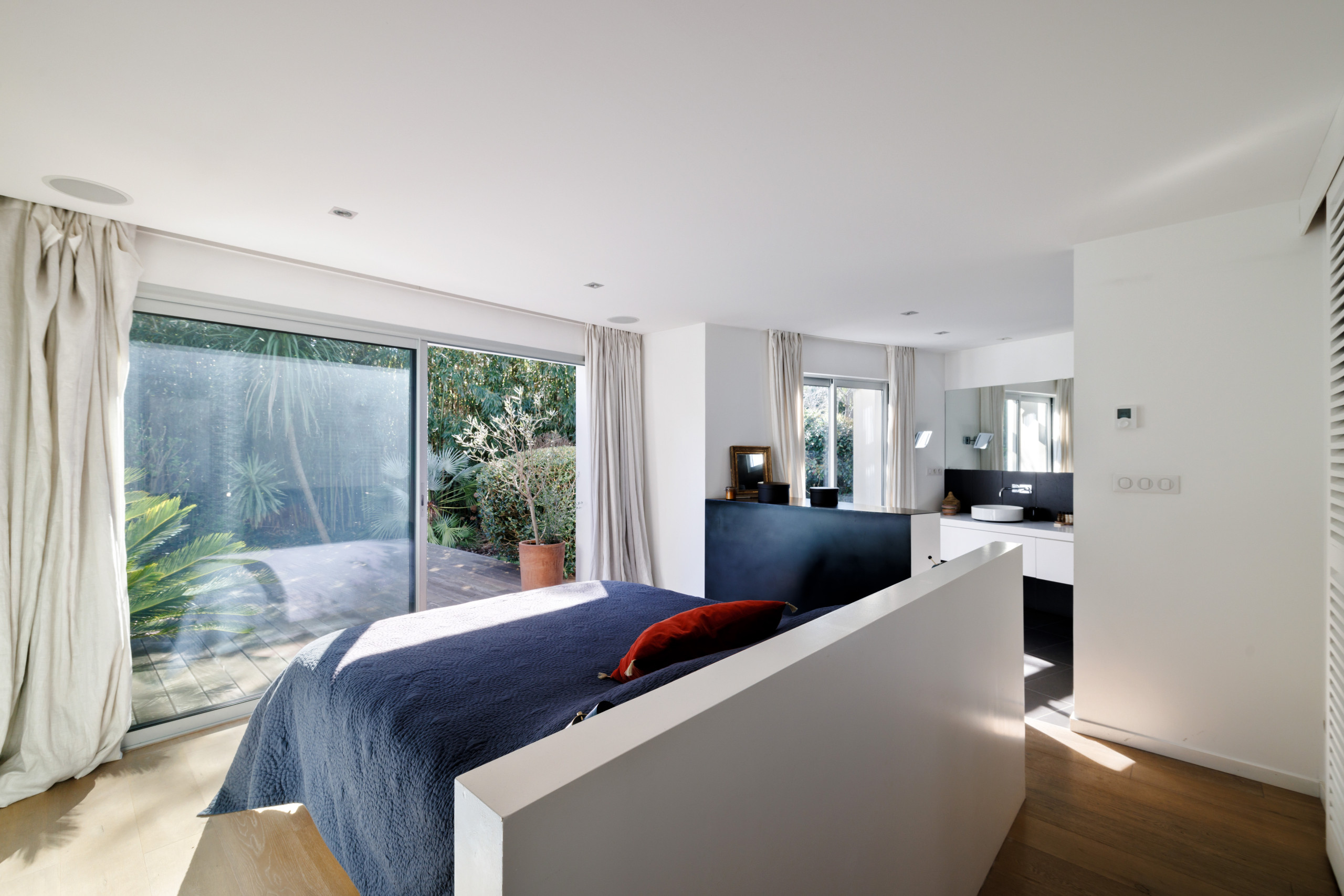 On the ground floor, set back from the living room, you will find a large suite with a queen-size bed, shower room, dressing room and toilet. This light-filled bedroom has bay windows giving direct access to the terrace. There is also a bathroom with bath on the ground floor.
