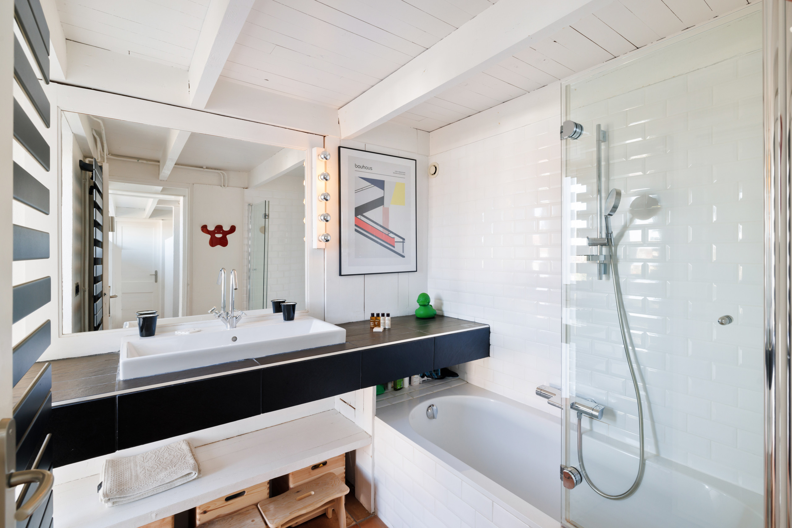 On the first floor, the villa offers 3 double bedrooms. The first has a large bay window, two trundle beds and a wardrobe. The second, just opposite, also has a bay window overlooking the garden, a queen-size bed and a wardrobe. On the other side of the corridor, the last bedroom also has a queen-size bed. Finally, there is a toilet and a shower room with plenty of storage space.