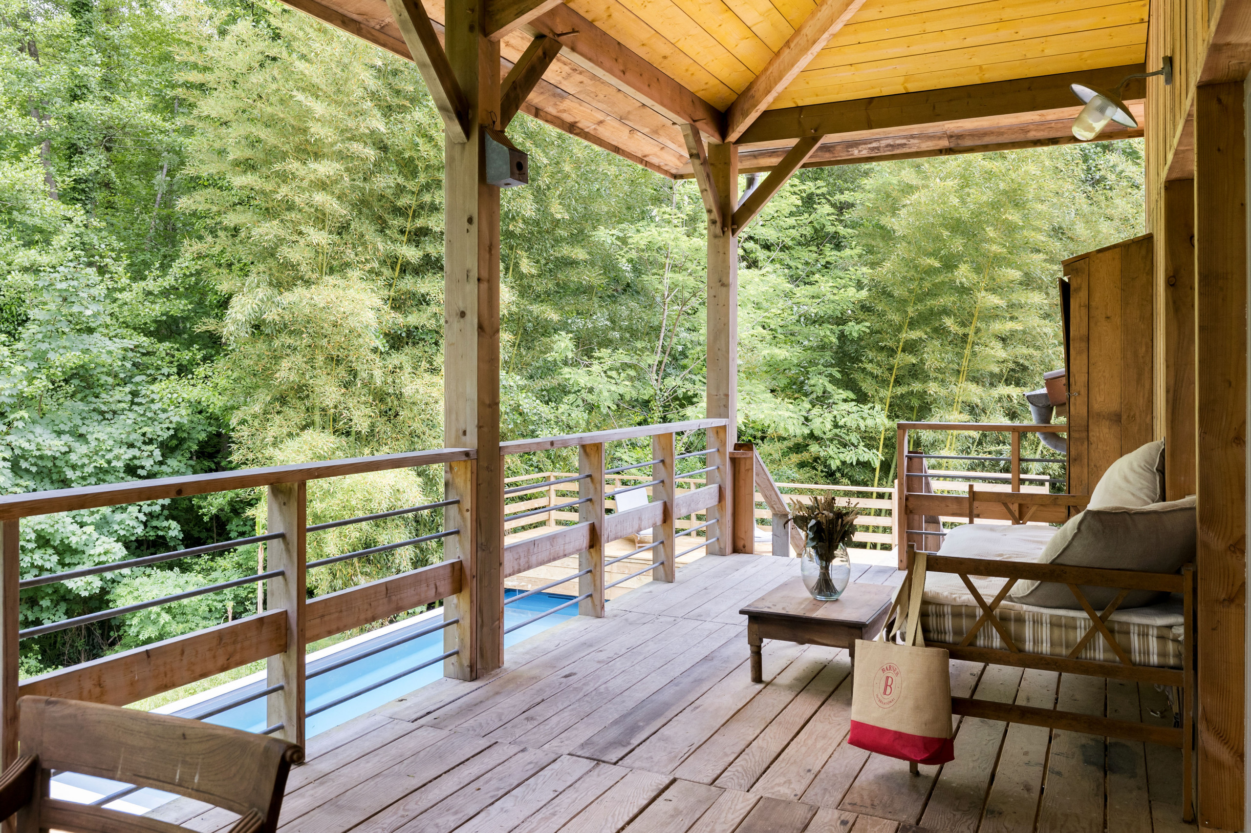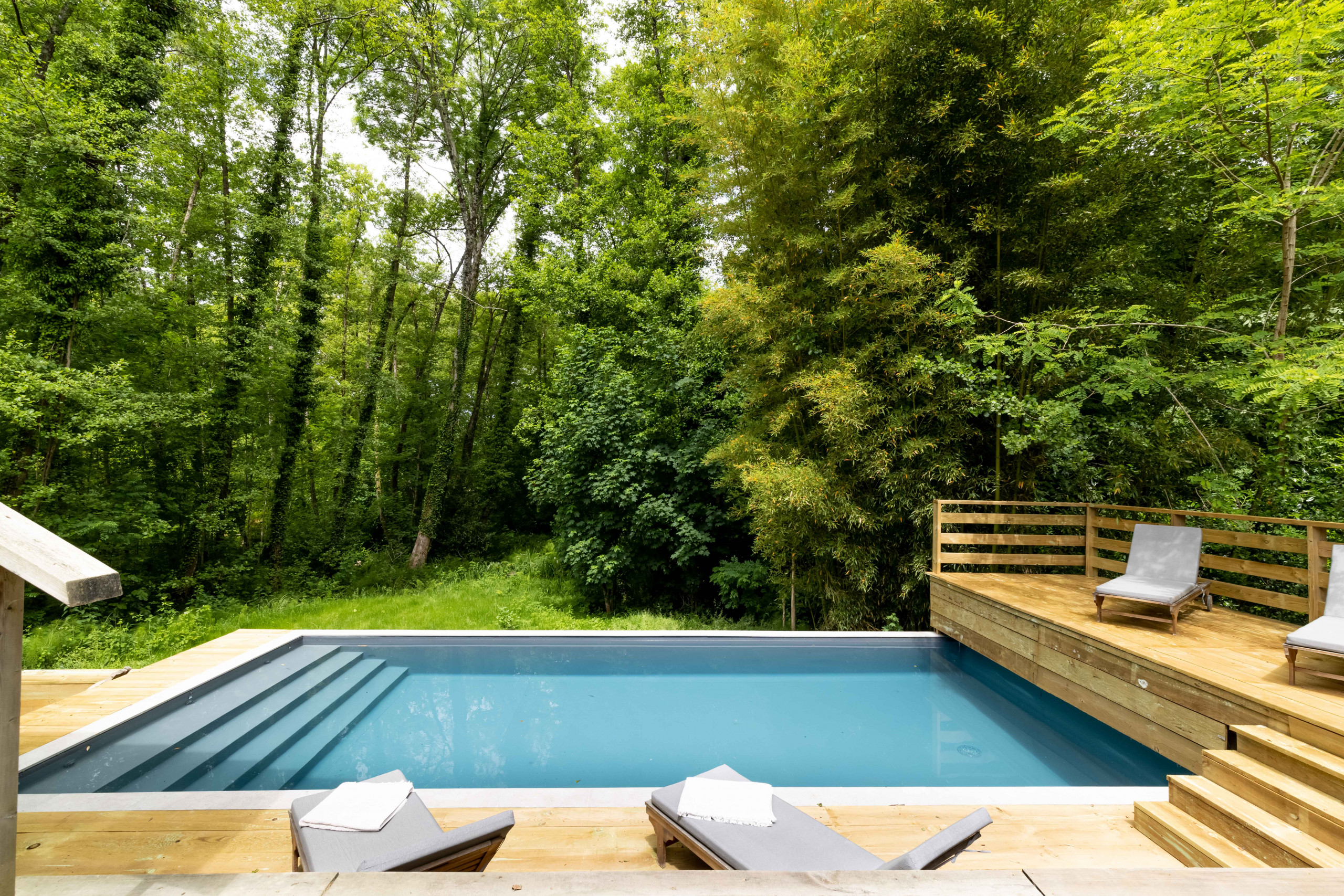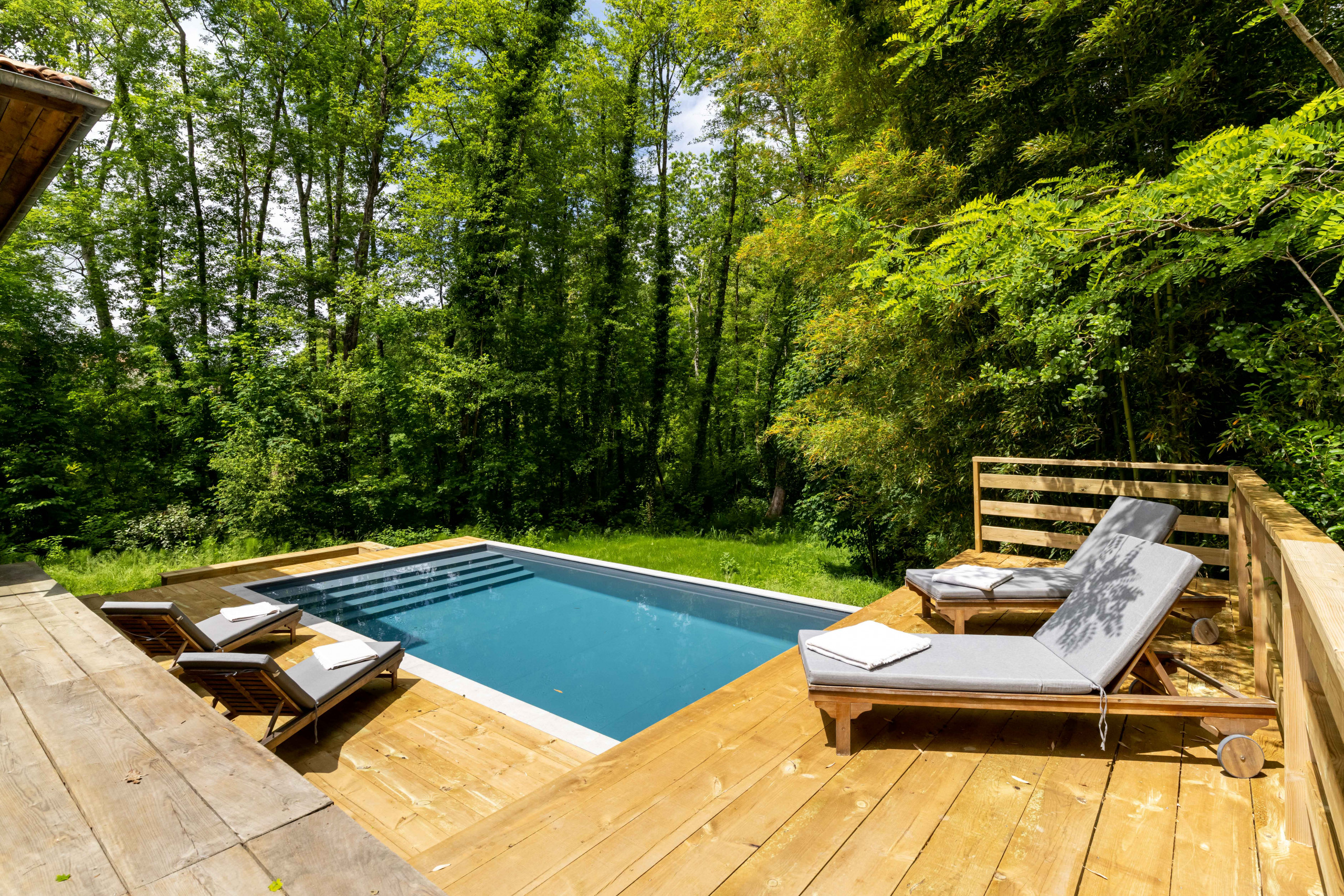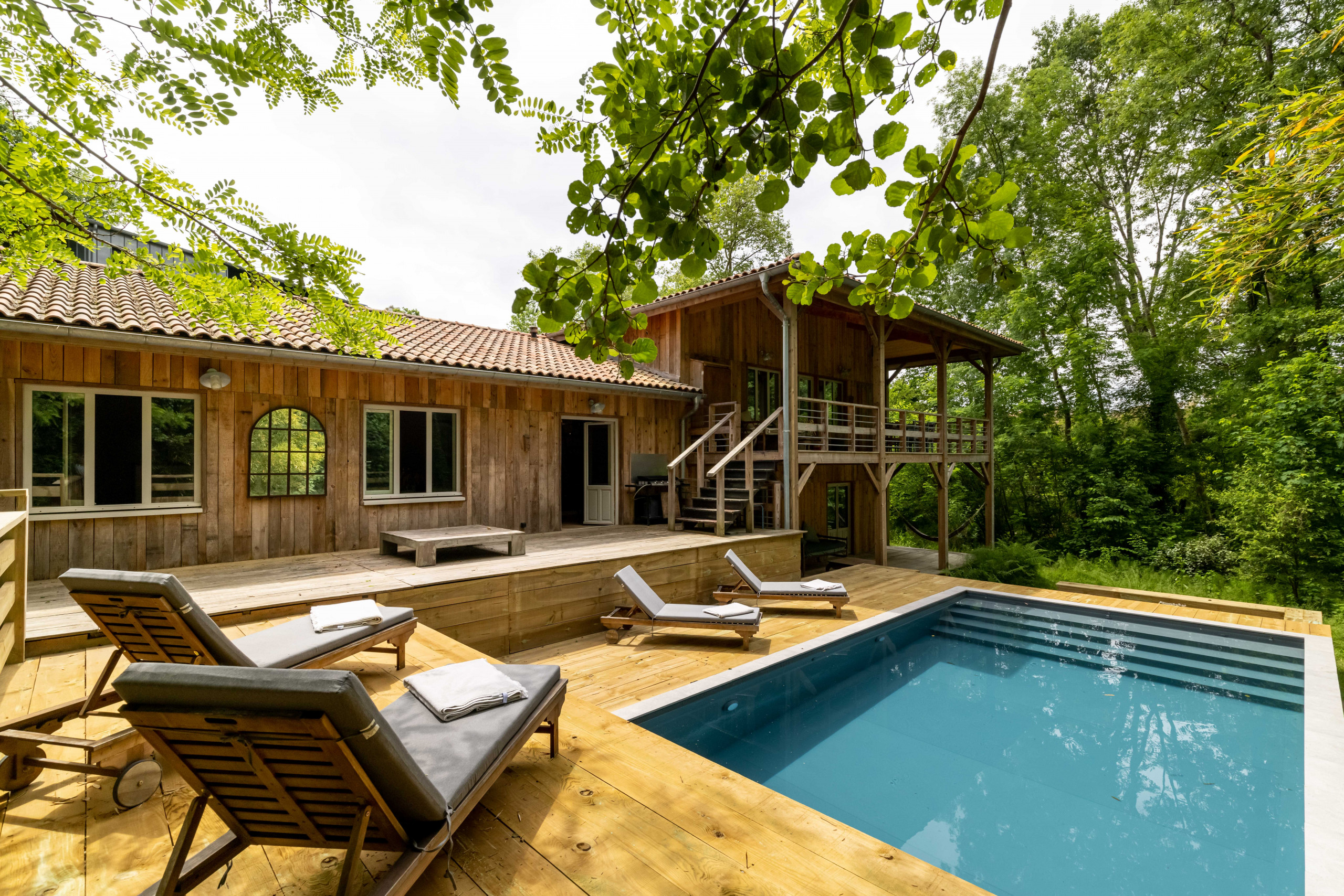Outside, take advantage of a beautiful terrace to share your meals "suspended" in the forest. A heated swimming pool is at your disposal with garden furniture (some parts are not safe for young children). Only the sound of birds and the nearby stream will disturb your relaxing afternoons by the pool.